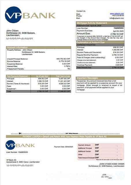 Liechtenstein VP Bank AG mortgage statement Word and PDF template download template file