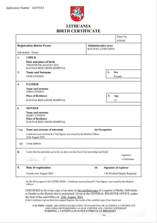 Lithuania birth certificate Word and PDF template download template file