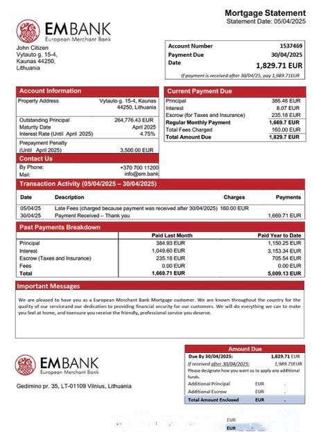 Lithuania European Merchant Bank mortgage statement Word and PDF template download template file