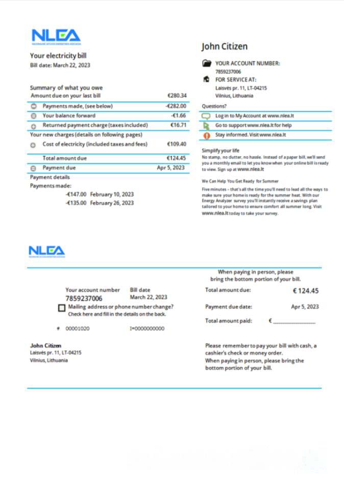 Lithuania National Lithuanian Energy Association utility bill Word and PDF template download template file
