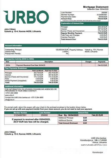Lithuania UAB Urbo bankas mortgage statement Word and PDF template download template file