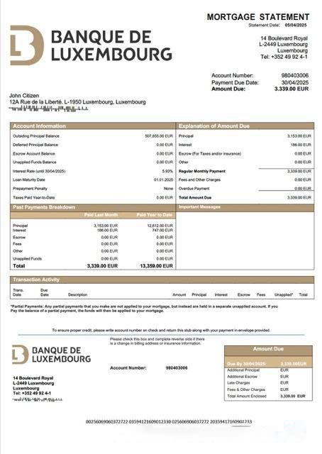 Luxembourg Banque de Luxembourg mortgage statement Word and PDF template download template file