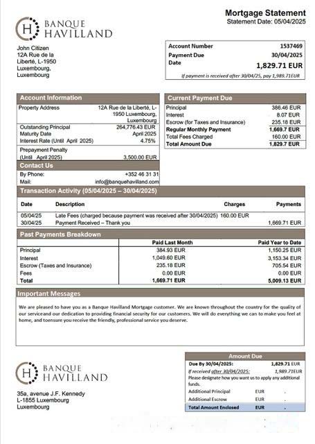 Luxembourg Banque Havilland mortgage statement Word and PDF template download template file