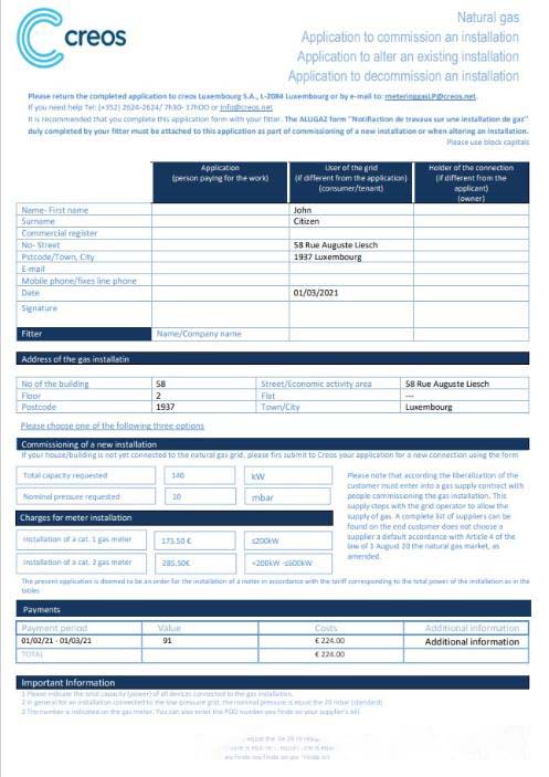 Luxembourg Creos gas utility bill template in Word and PDF format download template file