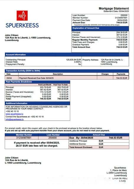 Be the first to review “Luxembourg Spuerkeess Bank mortgage statement Word and PDF template download template file”