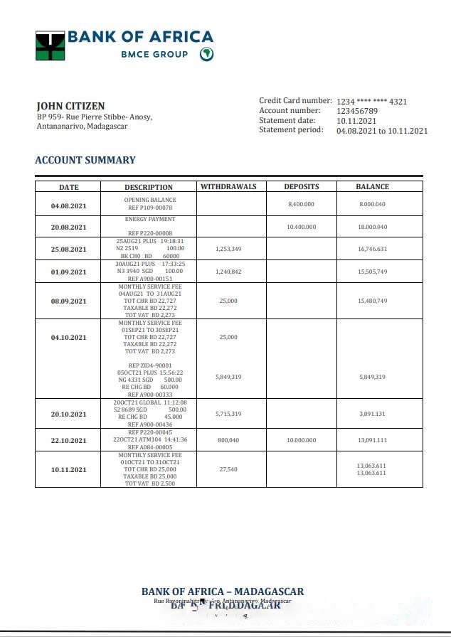Madagascar Bank of Africa bank statement download template file