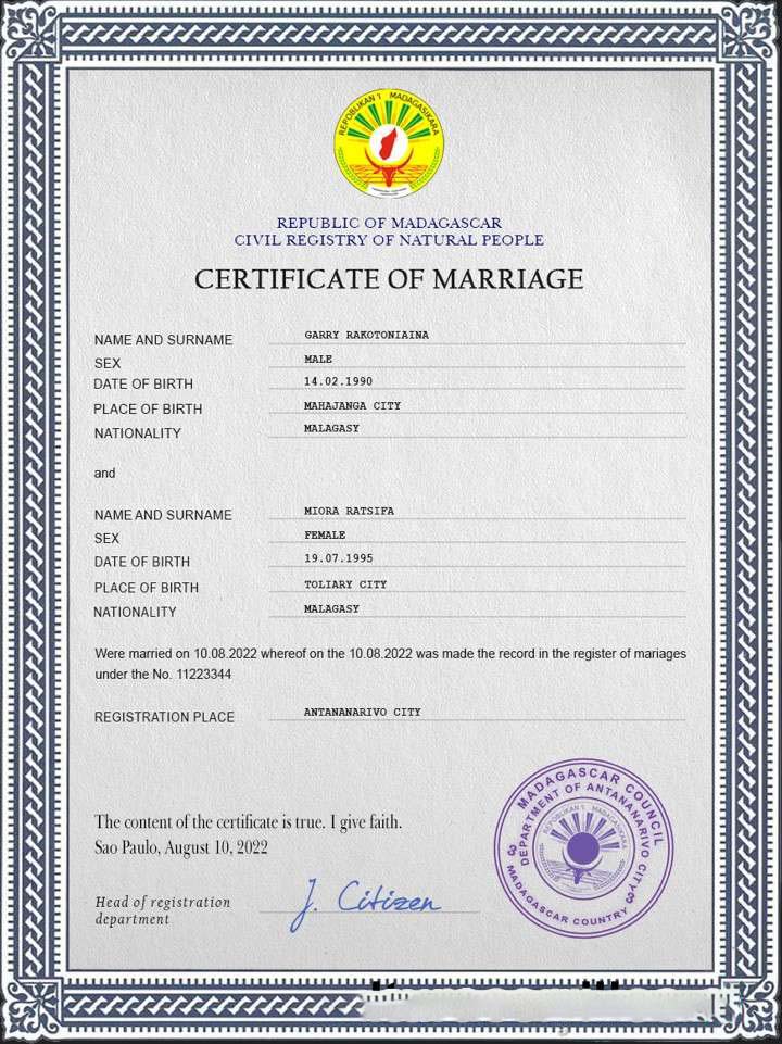 Madagascar marriage certificate PSD template download template file