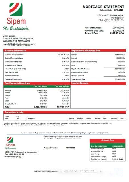 Madagascar SIPEM Banque mortgage statement Word and PDF template download template file