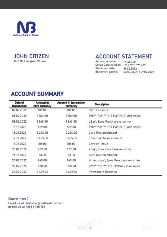 Malawi National Bank of Malawi bank statement template in Word and PDF format download template file