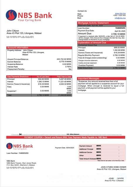 Malawi NBS Bank mortgage statement Word and PDF template download template file