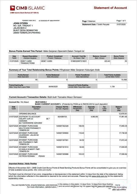 Malaysia CIMB Islamic Bank statement of account Word and PDF template download template file