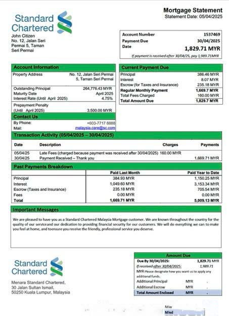 Malaysia Standard Chartered Malaysia mortgage statement Word and PDF template download template file