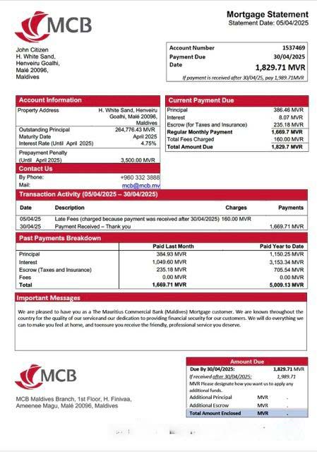 Maldives The Mauritius Commercial Bank (Maldives) mortgage statement Word and PDF template download template file