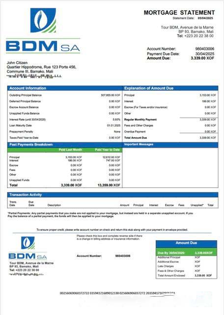 Mali Banque du Développement du Mali (BDM) mortgage statement Word and PDF template download template file