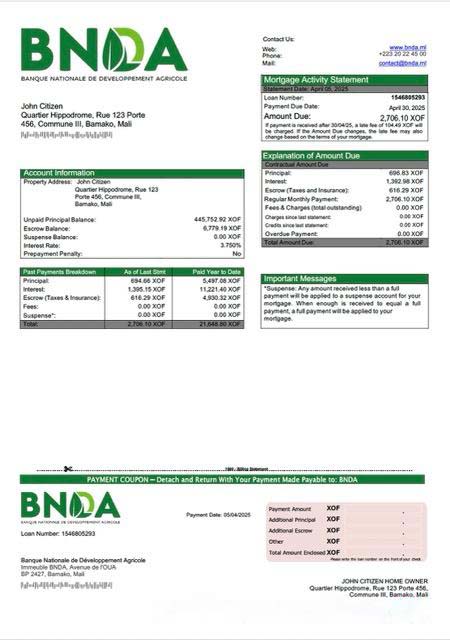 Mali Banque Nationale de Développement Agricole (BNDA) mortgage statement Word and PDF template download template file