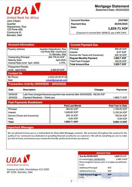 Mali United Bank for Africa Mali mortgage statement Word and PDF template download template file
