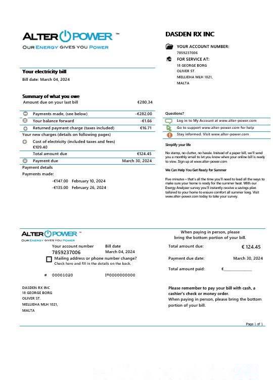 Malta AlterPower Malta proof of address business utility bill template in Word and PDF formats download template file