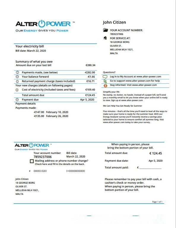 Malta AlterPower Malta proof of address utility bill template in Word and PDF format download template file