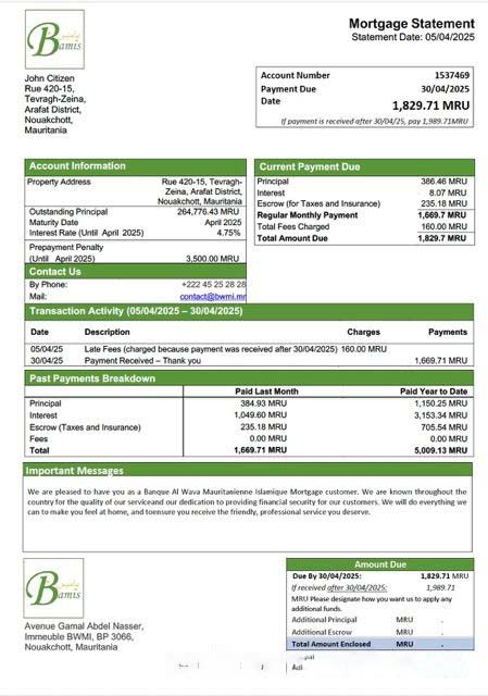 Mauritania Banque Al Wava Mauritanienne Islamique mortgage statement Word and PDF template download template file