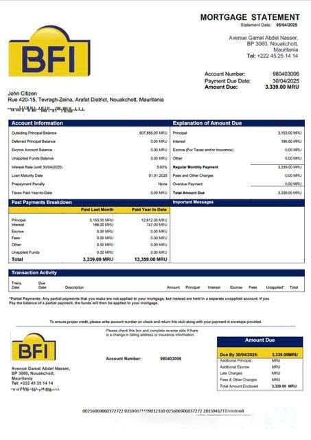Mauritania Banque des Financements Islamiques (BFI) mortgage statement Word and PDF template download template file