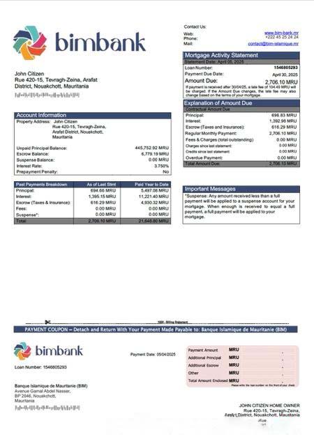 Mauritania Banque Islamique de Mauritanie (BIM) mortgage statement Word and PDF template download template file