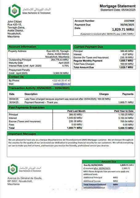 Mauritania Banque Mauritanienne de l’Investissement (BMI) mortgage statement Word and PDF template download template file