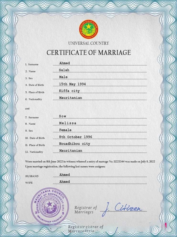 Mauritania marriage certificate PSD template download template file