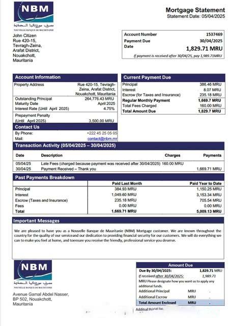 Mauritania Nouvelle Banque de Mauritanie (NBM) mortgage statement Word and PDF template download template file