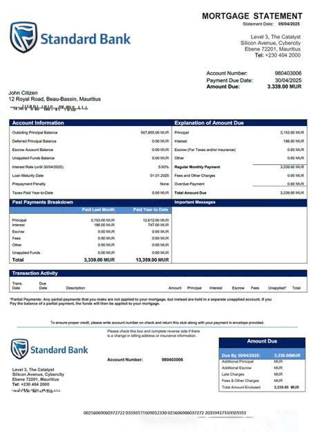 Mauritius Standard Bank (Mauritius) Limited mortgage statement Word and PDF template download template file