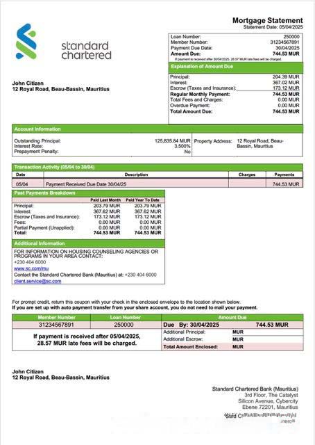 Mauritius Standard Chartered Bank (Mauritius) mortgage statement Word and PDF template download template file