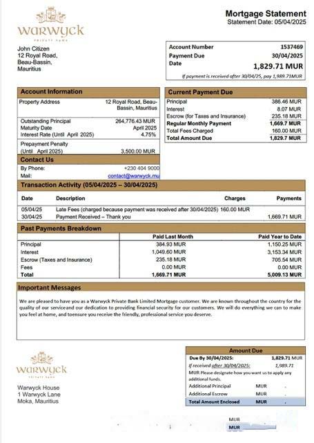 Mauritius Warwyck Private Bank Limited mortgage statement Word and PDF template download template file