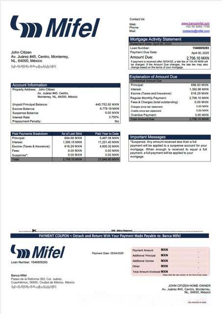 Mexico Banca Mifel mortgage statement Word and PDF template download template file