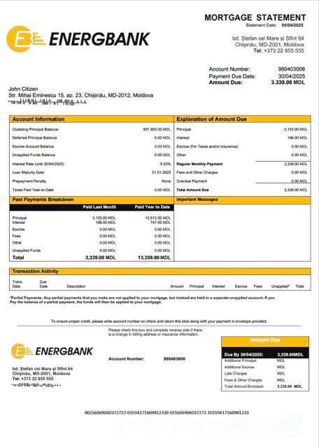 Moldova Energbank mortgage statement Word and PDF template download template file