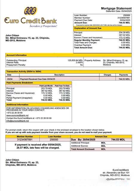 Moldova EuroCreditBank mortgage statement Word and PDF template download template file