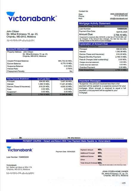 Moldova Victoriabank mortgage statement Word and PDF template download template file