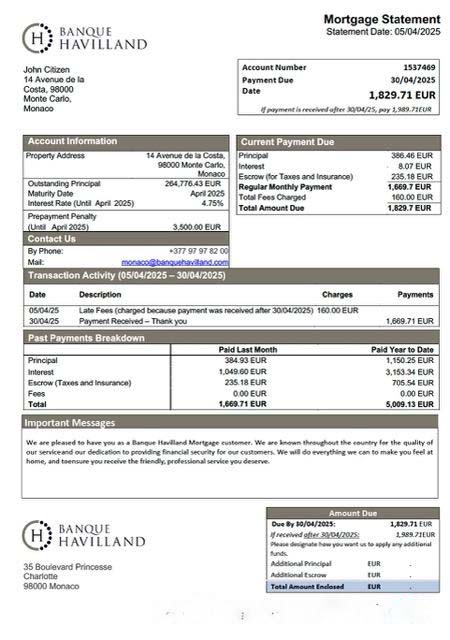 Monaco Banque Havilland mortgage statement Word and PDF template download template file