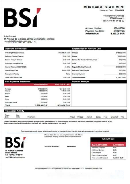 Monaco BSI Monaco mortgage statement Word and PDF template download template file