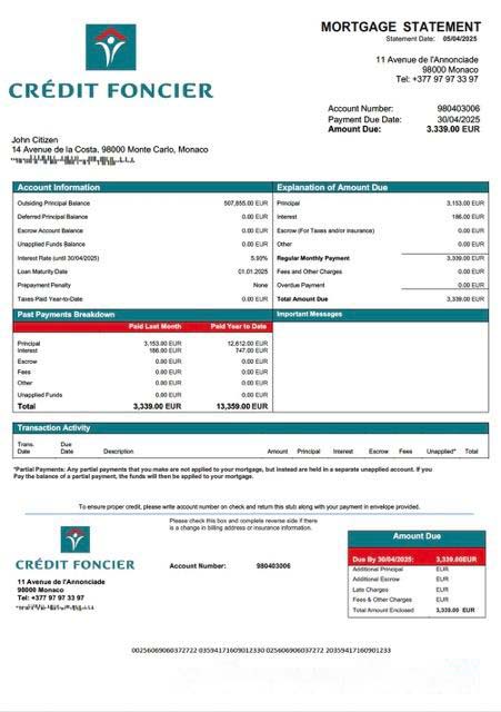 Monaco Credit Foncier de Monaco mortgage statement Word and PDF template download template file