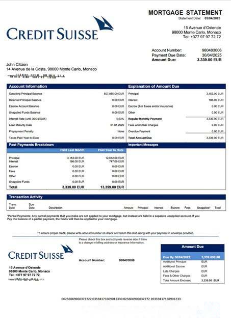 Monaco Credit Suisse (Monaco) mortgage statement Word and PDF template download template file