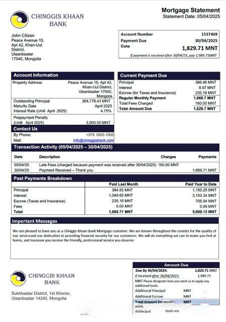 Mongolia Chinggis Khaan Bank mortgage statement Word and PDF template download template file