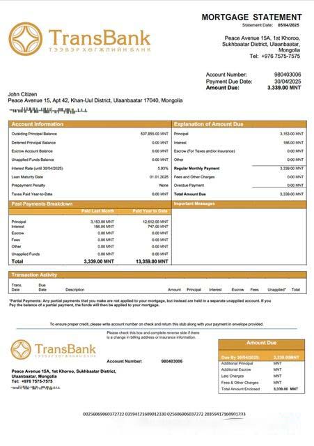 Mongolia Trans Bank mortgage statement Word and PDF template download template file