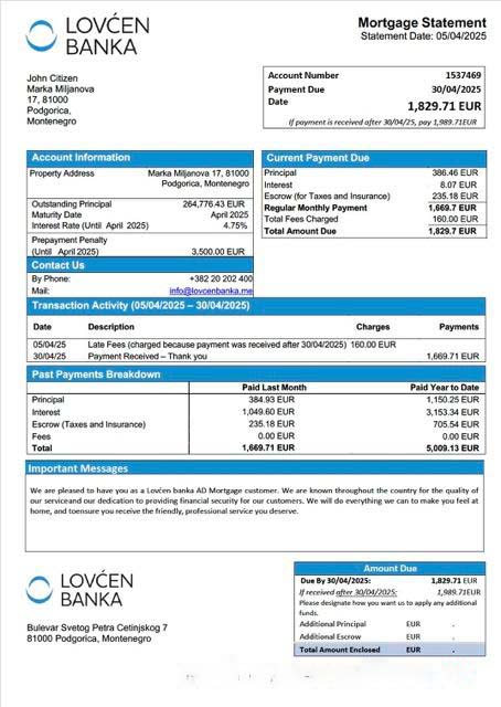 Montenegro Lovćen banka AD mortgage statement Word and PDF template download template file