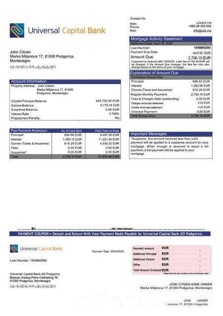 Montenegro Universal Capital Bank AD Podgorica mortgage statement Word and PDF template download template file