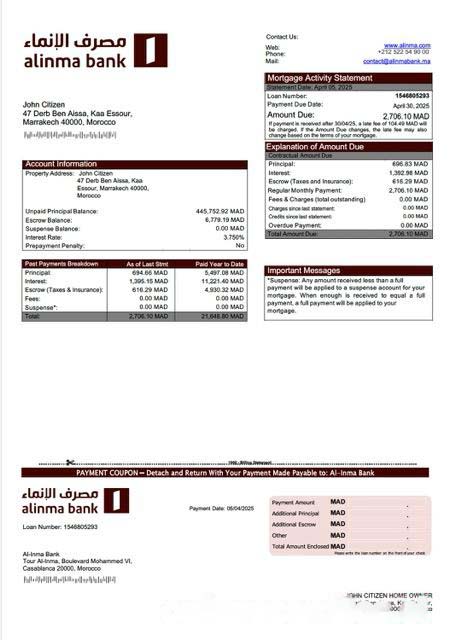 Morocco Al Inma Bank mortgage statement Word and PDF template download template file