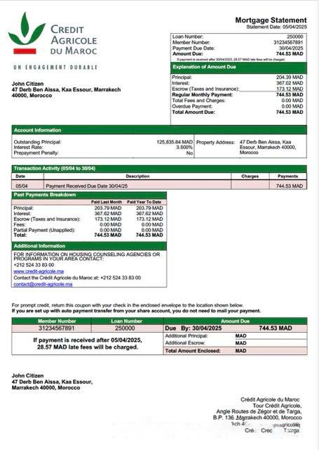 Morocco Crédit Agricole du Maroc mortgage statement Word and PDF template download template file