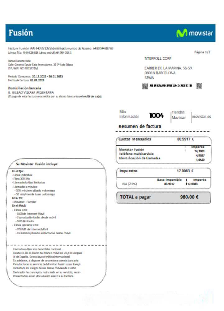 Movistar Fusion telecom operator utility business bill, SCR download template file