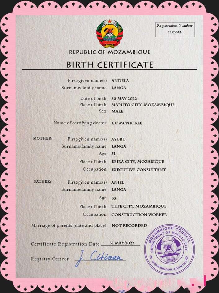 Mozambique birth certificate PSD template download template file