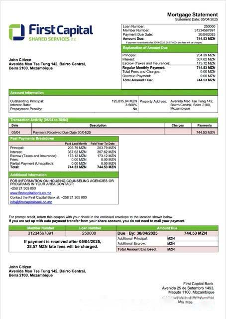 Mozambique First Capital Bank mortgage statement Word and PDF template download template file