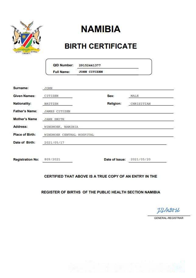 Namibia birth certificate Word and PDF template download template file