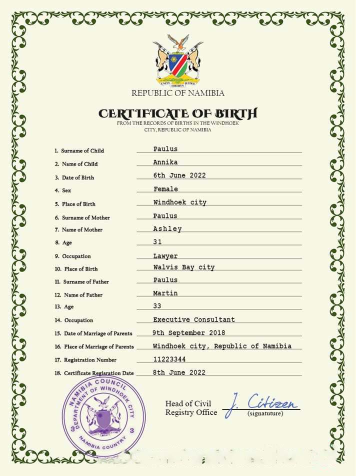 Namibia vital record birth certificate PSD template download template file